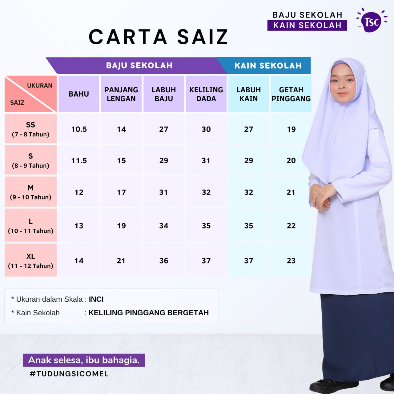 *Ukuran mungkin tidak tepat 100% pada badan Si Comel puan kerana ukuran kita adalah ukuran umum kanak-kanak. Sekiranya terlebih/kurang dalam +/- 1 inci adalah perkara biasa. Eloknya lebih sedikit sebab budak akan membesar (^_^).